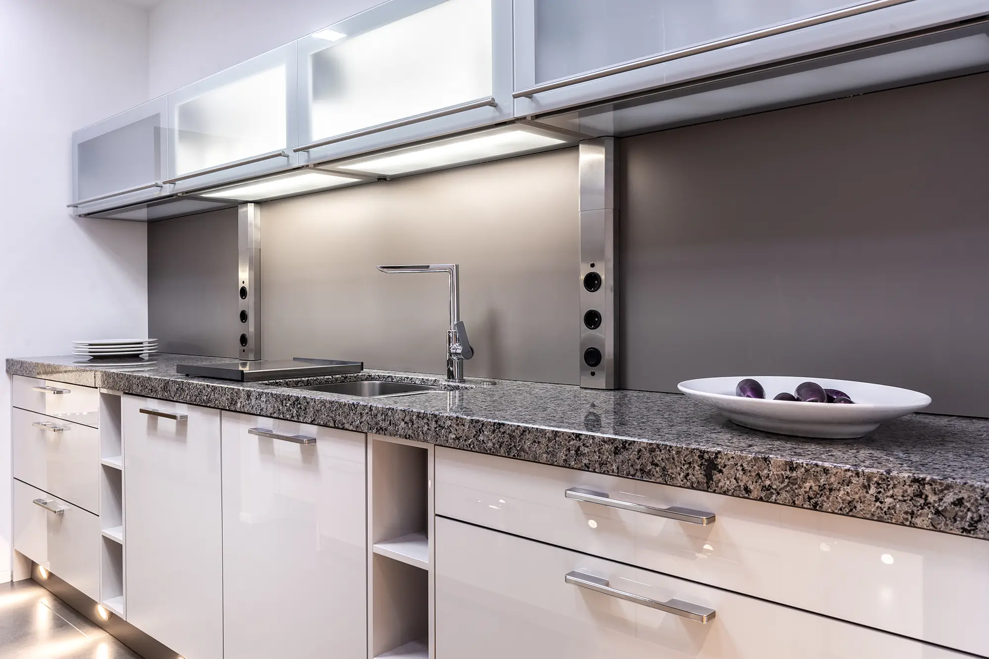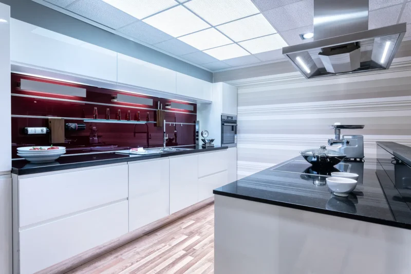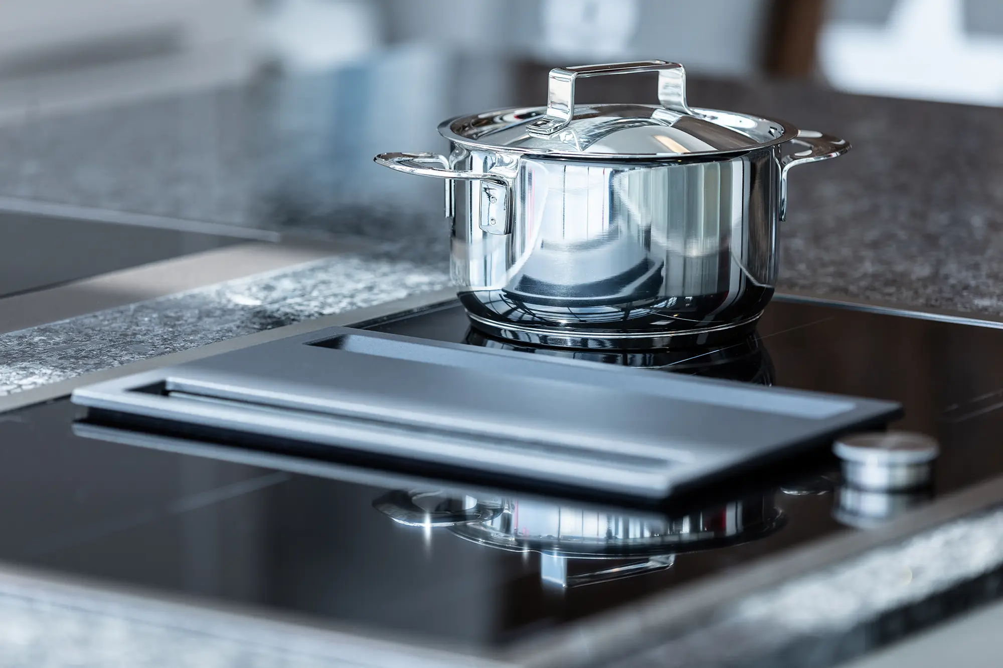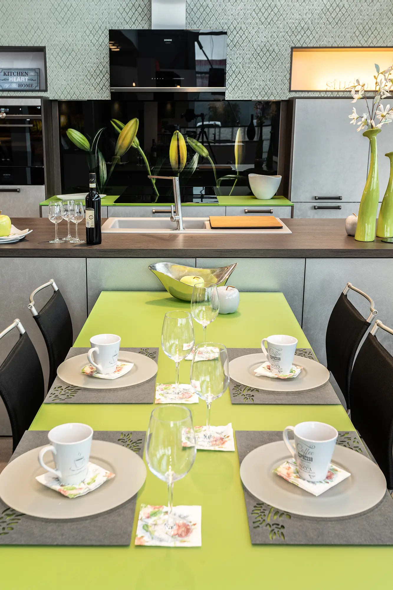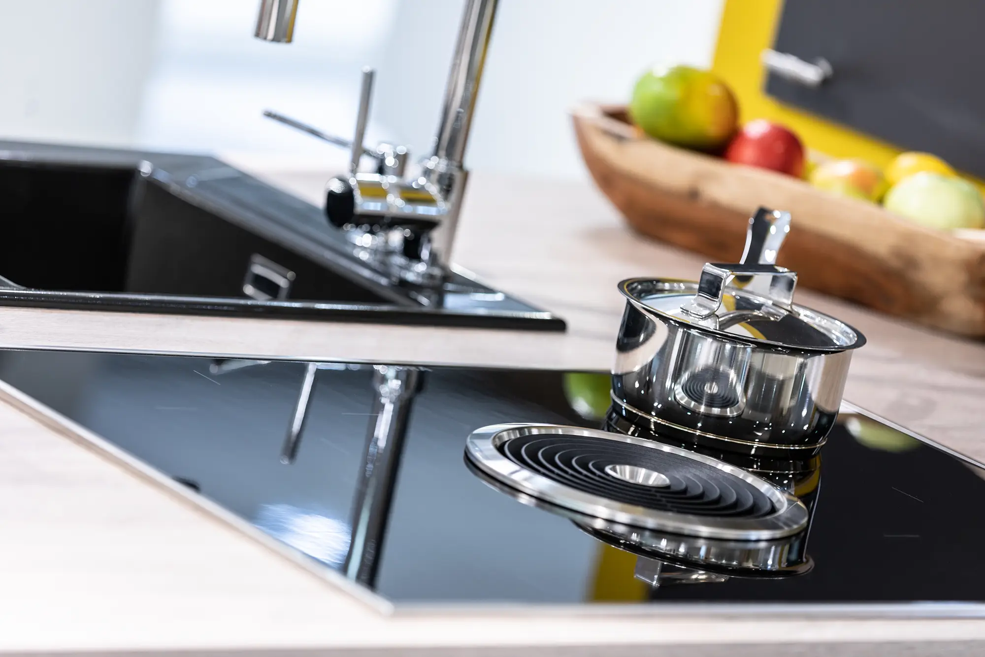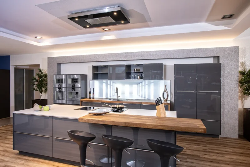 Horizontale Strukturen und reduzierte Formen verbinden Küche und Kochinsel zu einer modernen, durchgängigen Einheit.